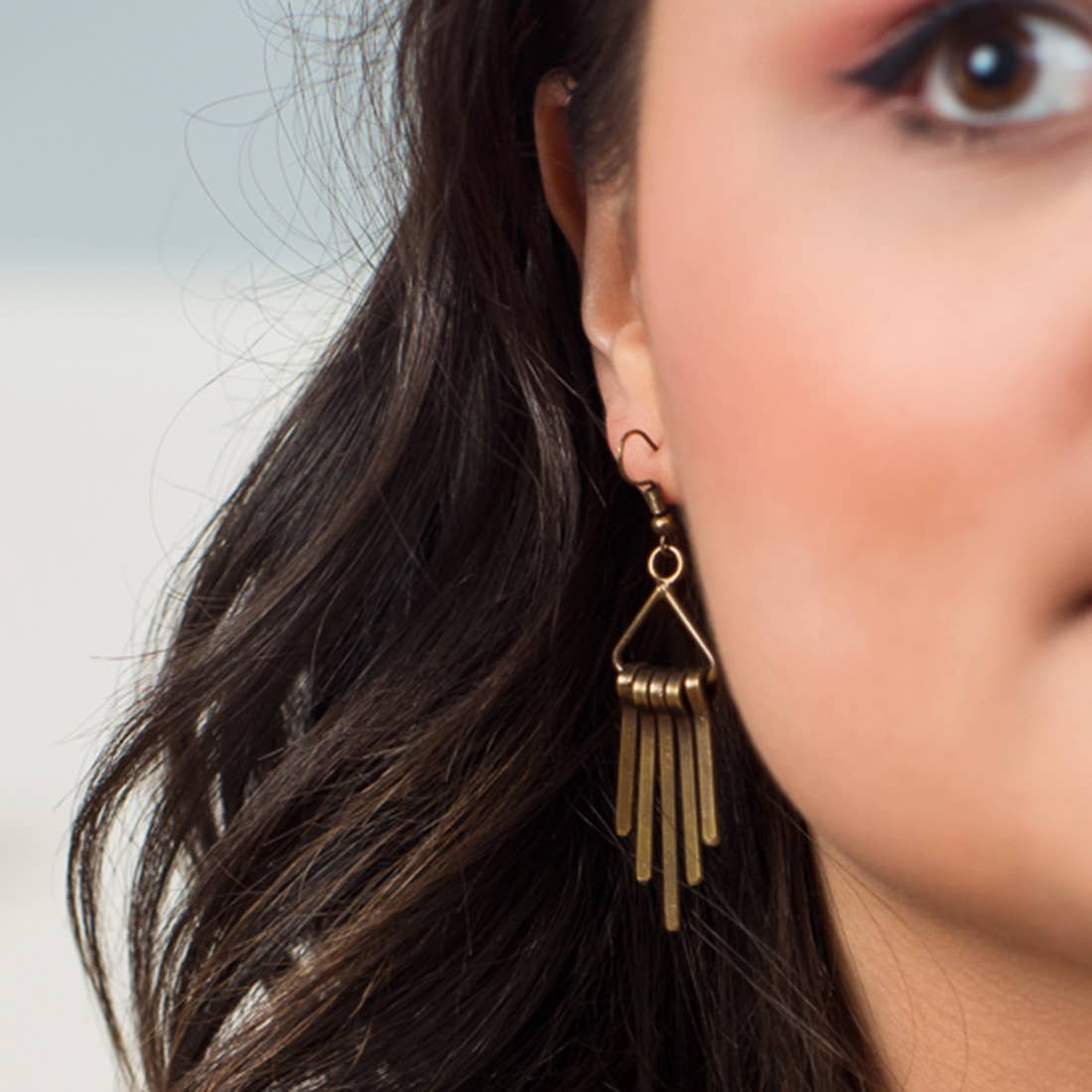 Add a touch of timeless western style to your outfit with the Prairie Chimes Earrings, a rustic bronze dangle design that blends vintage charm with modern flair. These earrings feature layered metal bars that swing freely, catching the light with every step, creating movement and shine that makes them a true statement piece.