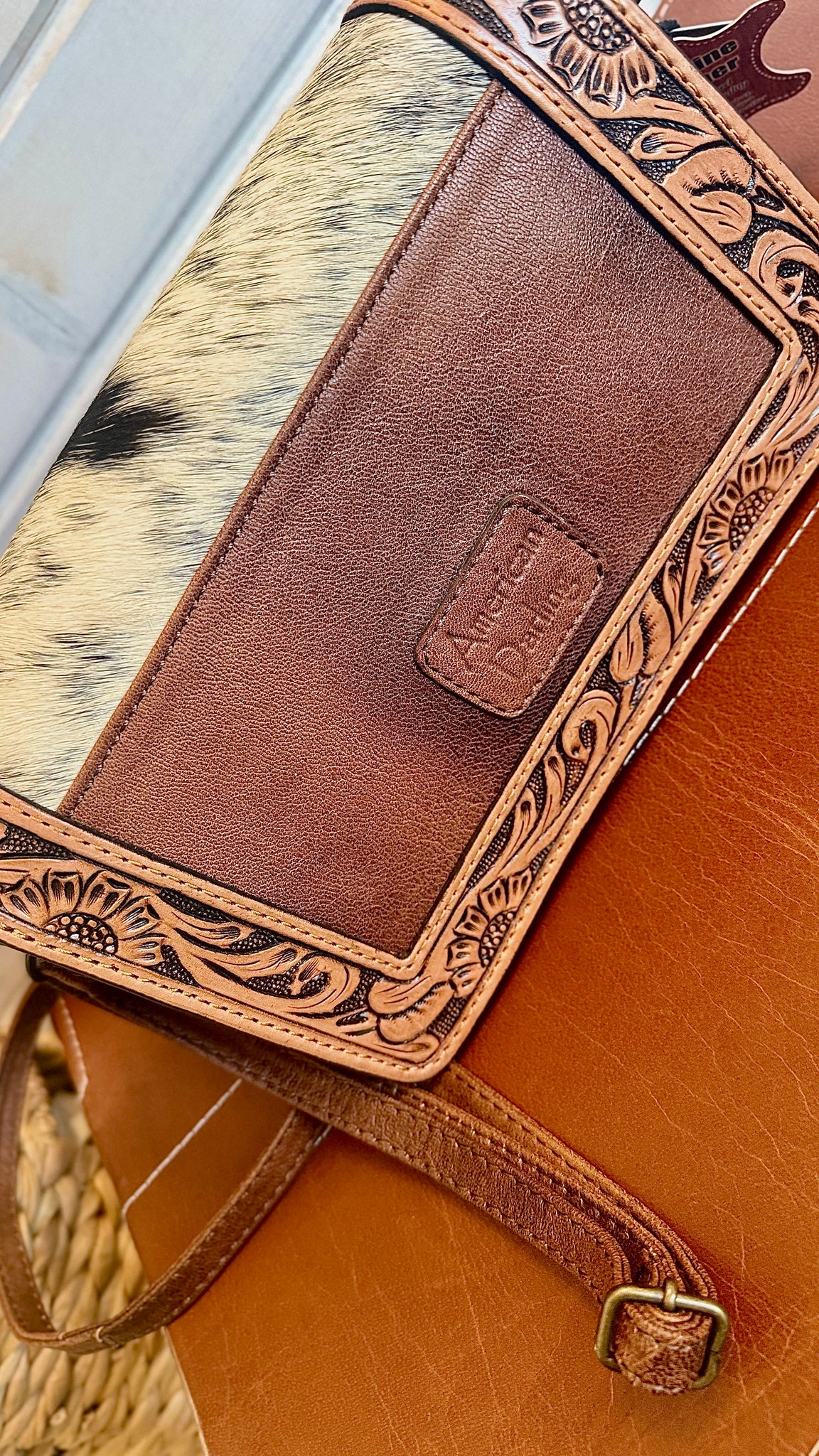 Every detail tells a story: from the hand-cut leather details, to the sturdy strap built for everyday wear. Inside, you’ll find plenty of room to tuck away your daily must-haves—wallet, phone, keys, and even an emergency tube of lipstick. This cowhide and tooled leather bag blends rugged durability with refined beauty, making it just as at home at the rodeo as it is at Sunday brunch.