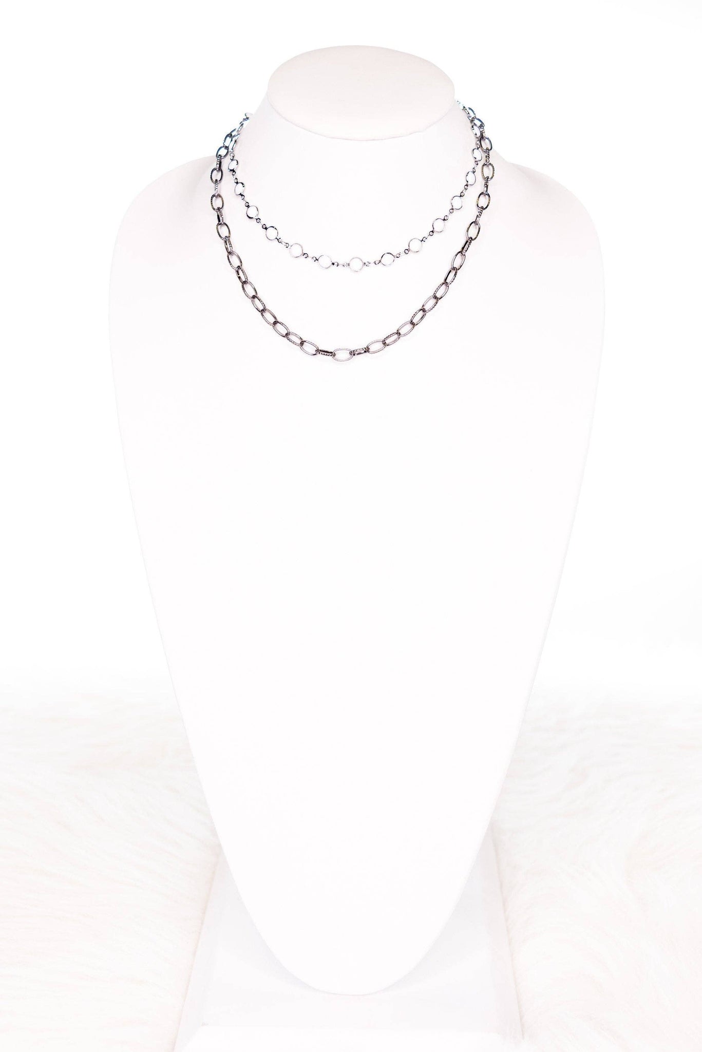 Double strand, adjustable necklace. One strand features fun puff beads and the other is a thick chain-link strand. 9" long