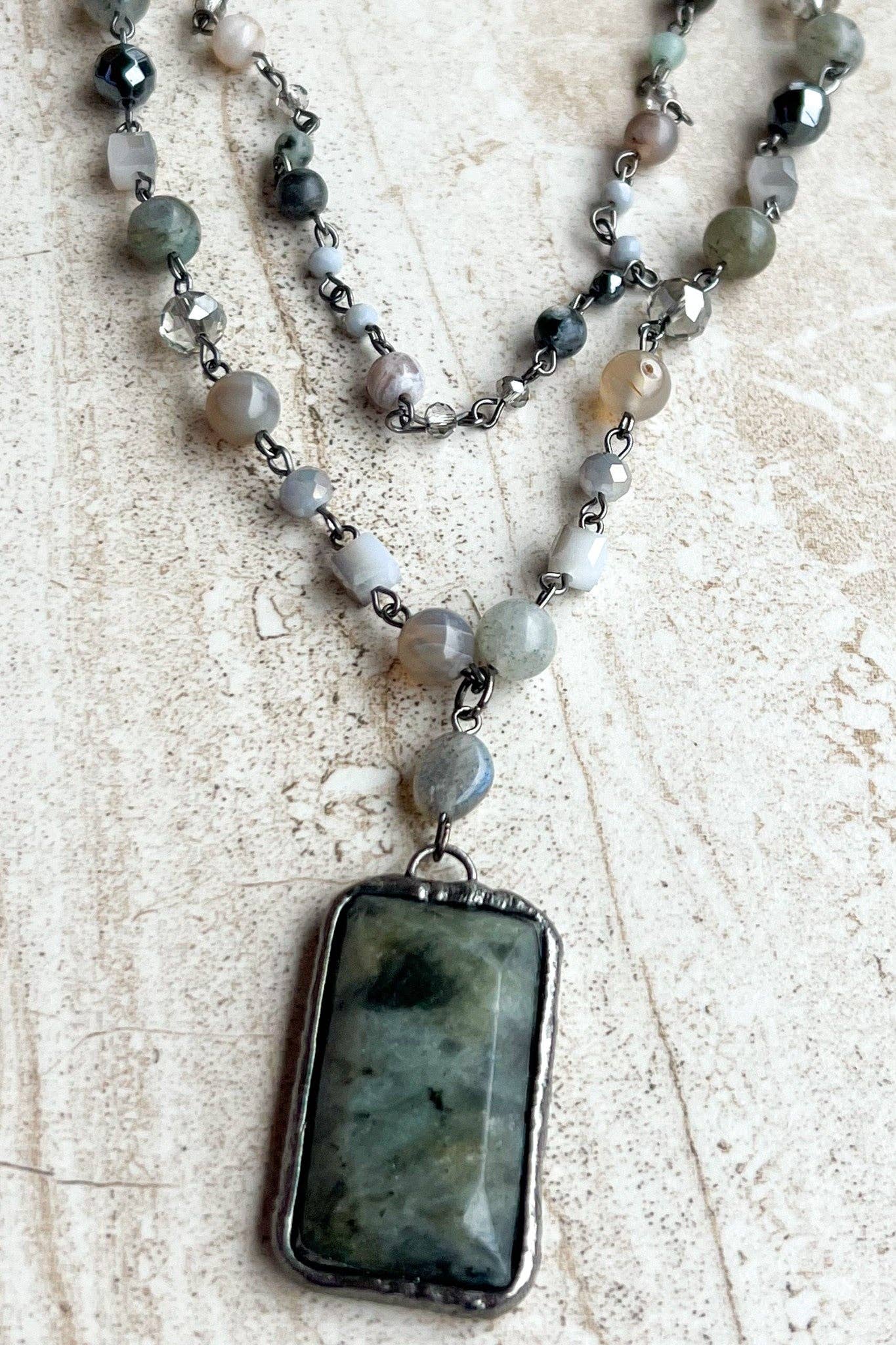 Multi-strand necklace with adjustable lobster claw closure and 2" extension. Each strand is a beaded chain link. The longer strand has a soldered rectangle stone pendant. Length: 18.5" Short Strand: 16" Pendant: 1.5"