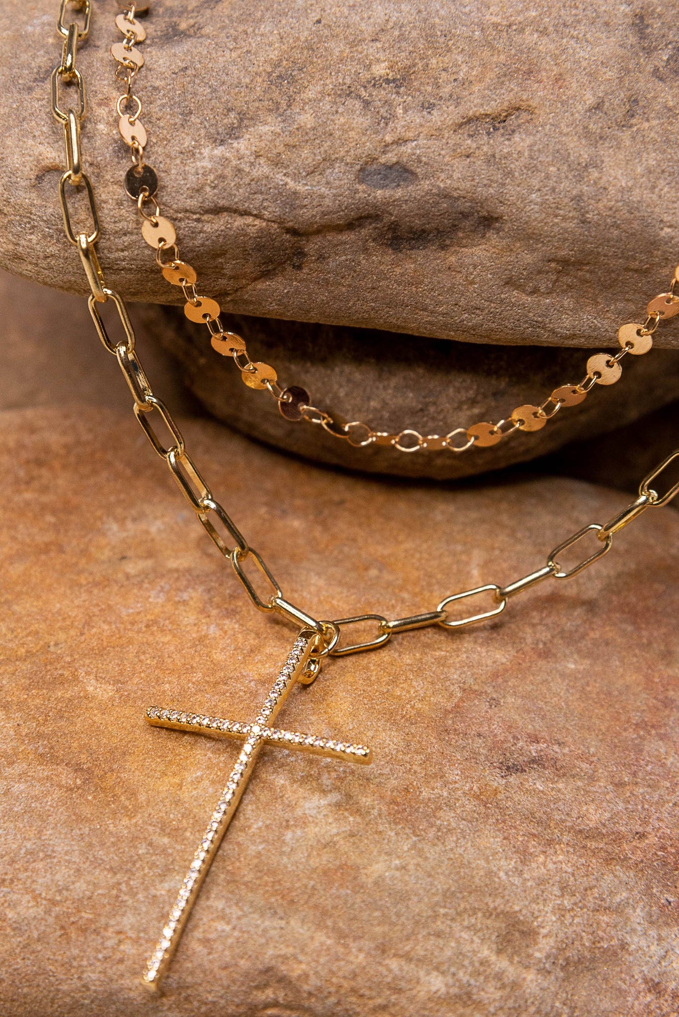 Gold, double layer necklace. One layer is a disc chain and the other is a link chain with a rhinestone cross pendant. Come with a lobster claw closer and a 2" extender.