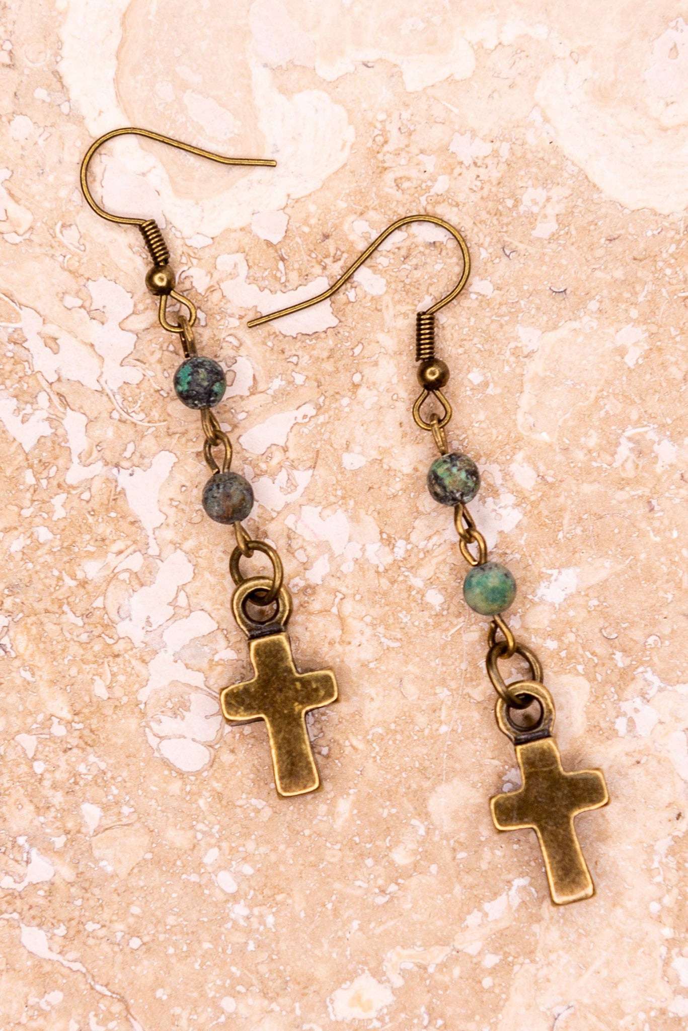 These fishhook dangle earrings have two small African Turquoise stone beads and a small cross charm. They are lightweight. Length: 2"