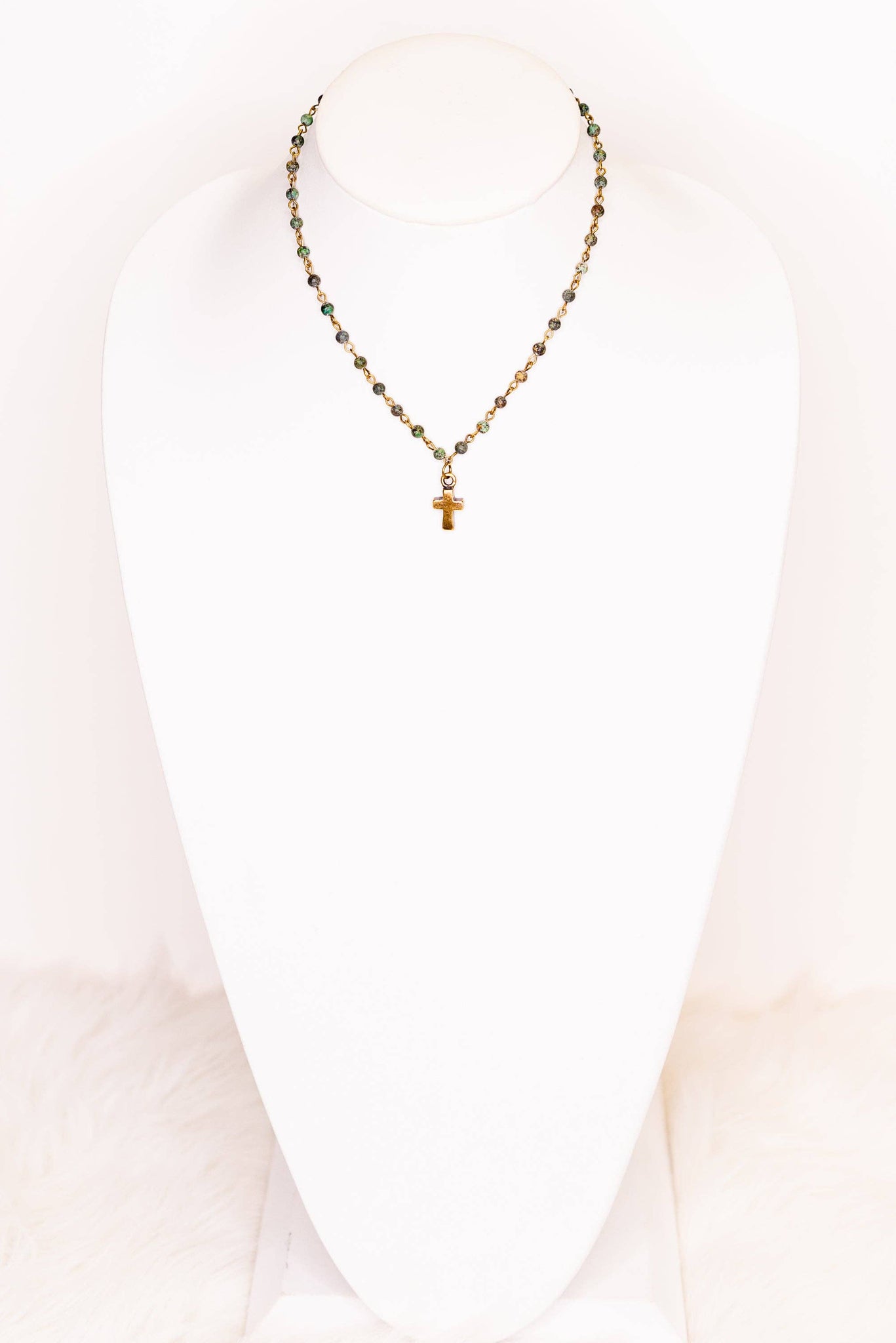 This short, adjustable necklace has small African Turquoise stone beads connected with chain links. Features a small bronze cross charm. Longest Length: 10" Shortest Length: 9" Cross Charm: .5"