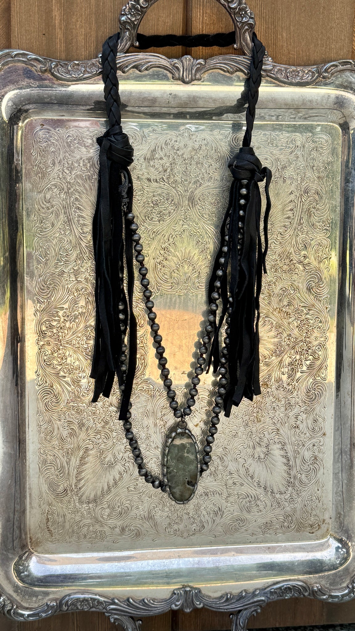 Turn heads and stir up stories with this one-of-a-kind handmade western necklace that’s as bold as the open prairie. This piece blends black suede fringe ties, braided leather detail, and a strand of antique silver Navajo pearl–style beads leading to a striking natural stone pendant.